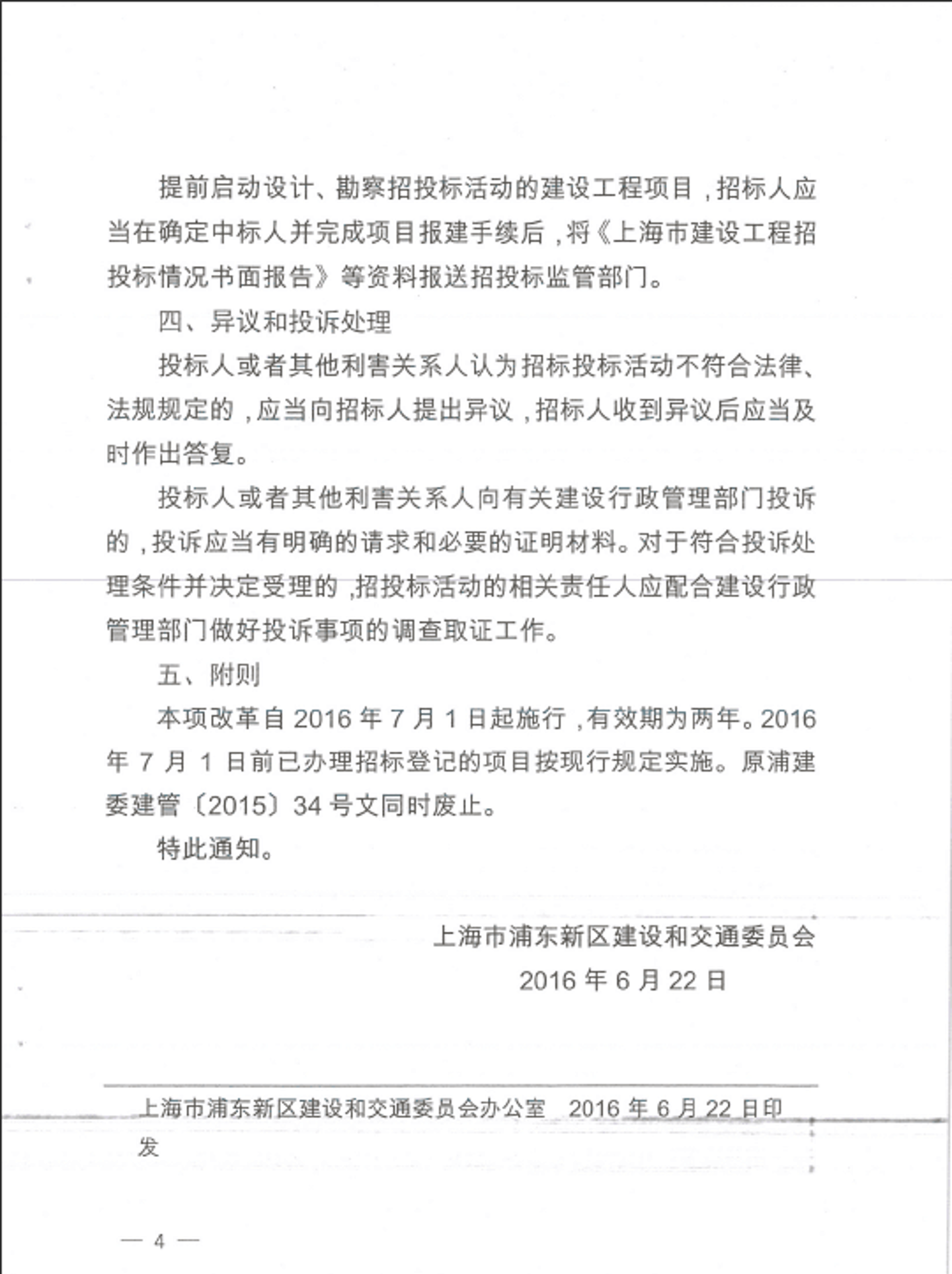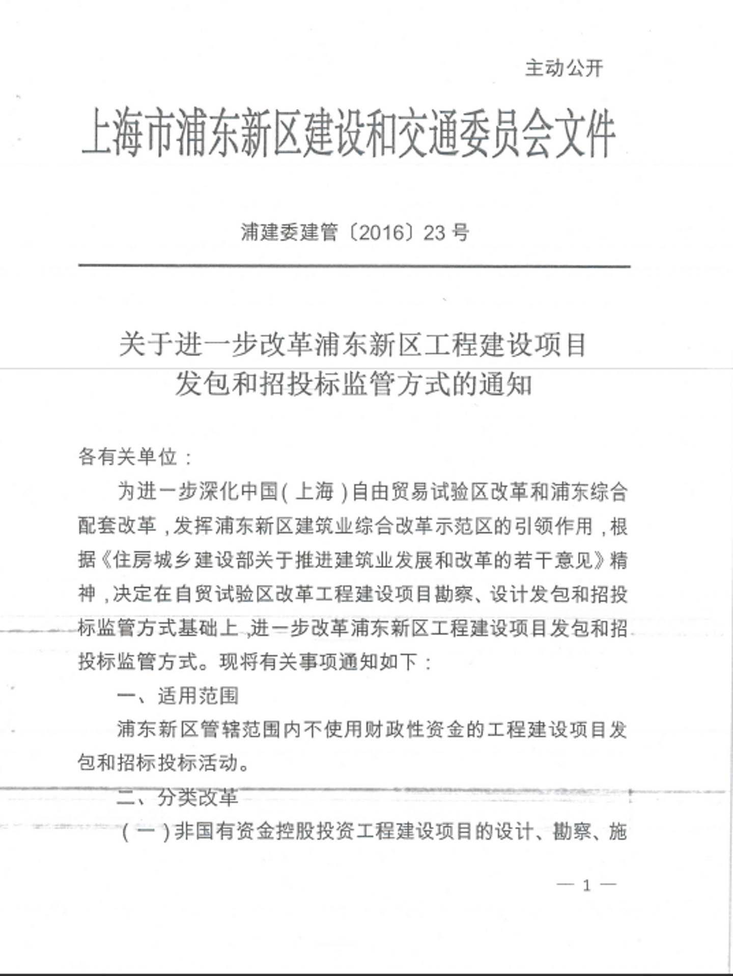 进一步改革浦东新区工程建设项目发包和招投标监管方式 (浦建委建管[2016]23号)