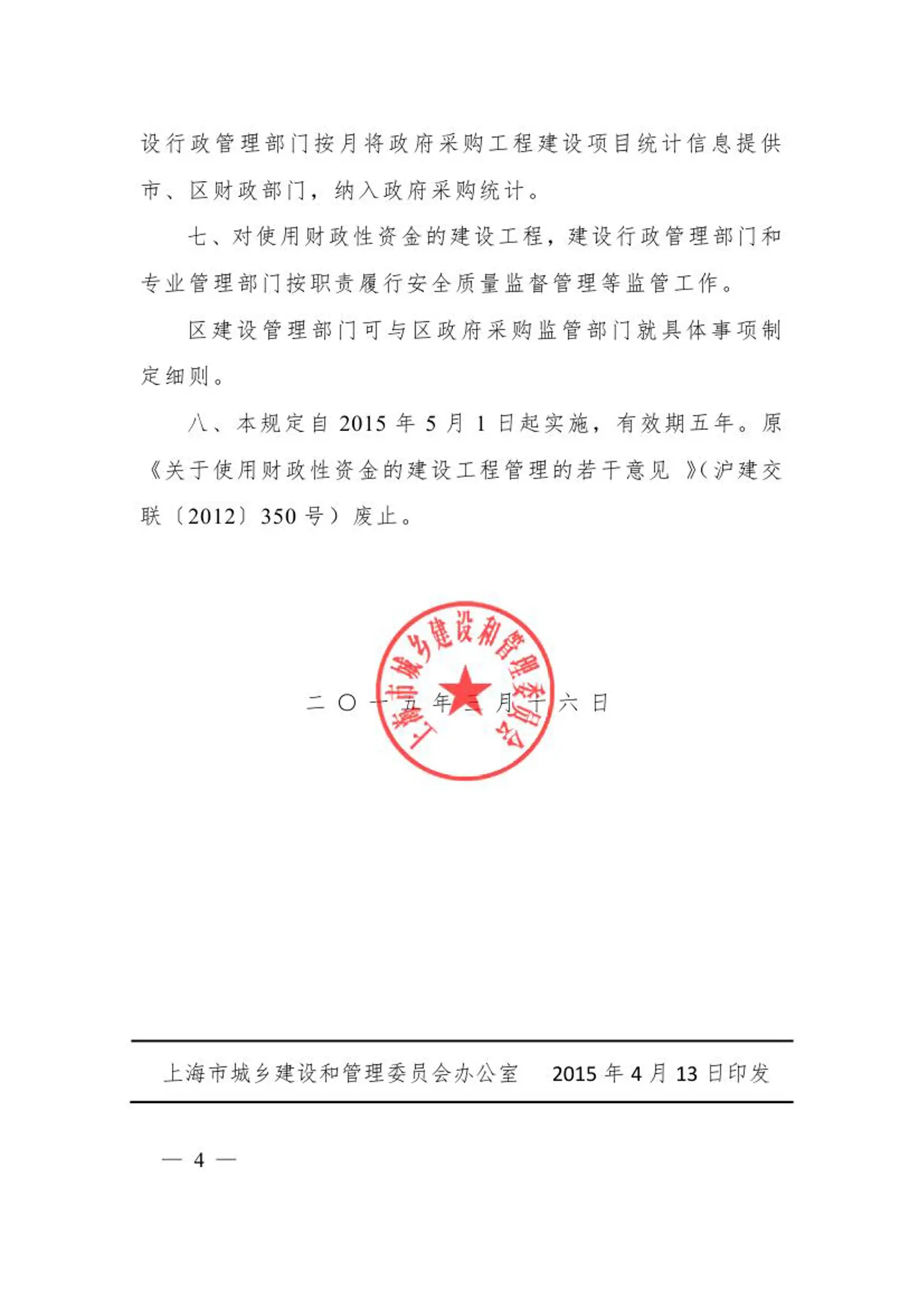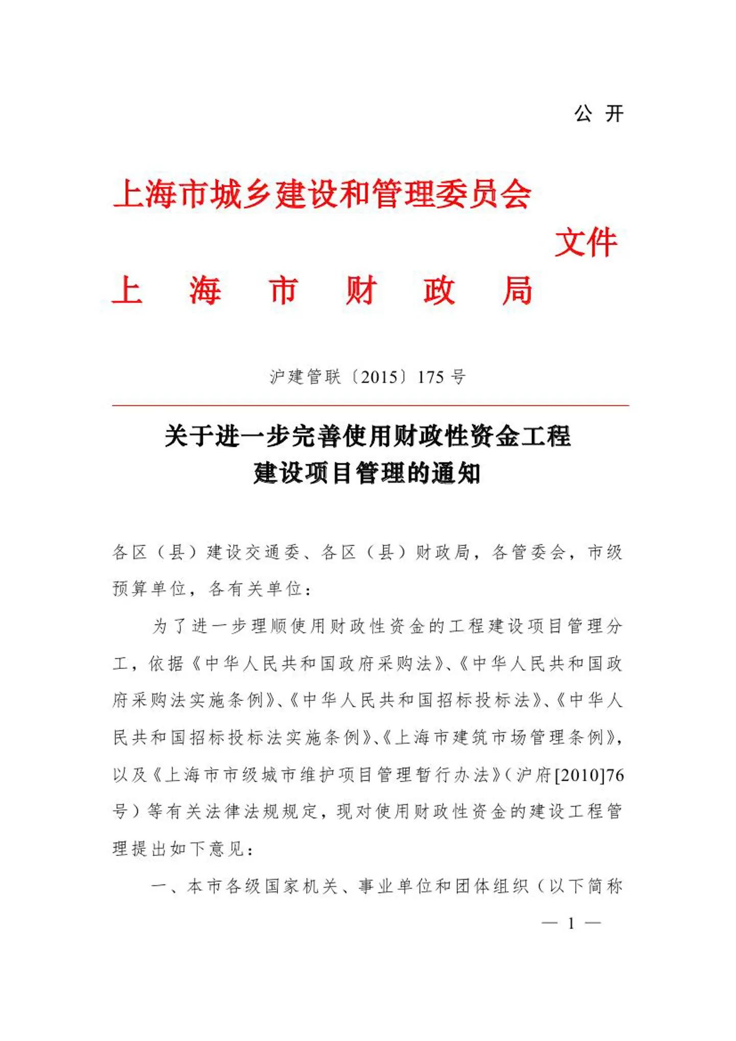 关于进一步完善使用财政性资金工程建设项目管理的通知 (沪建管联〔2015〕175 号)