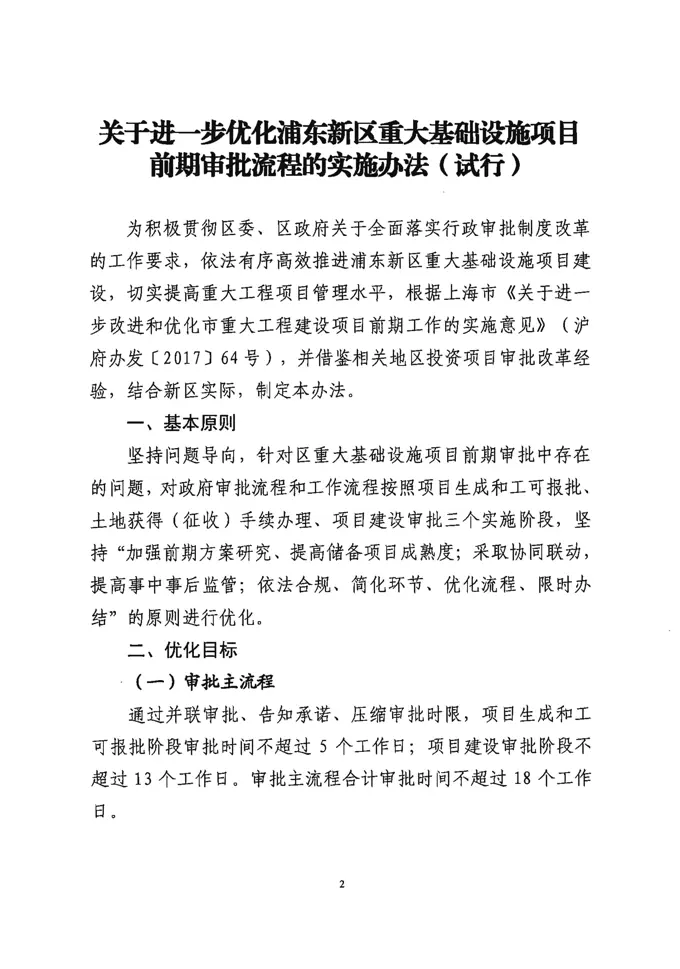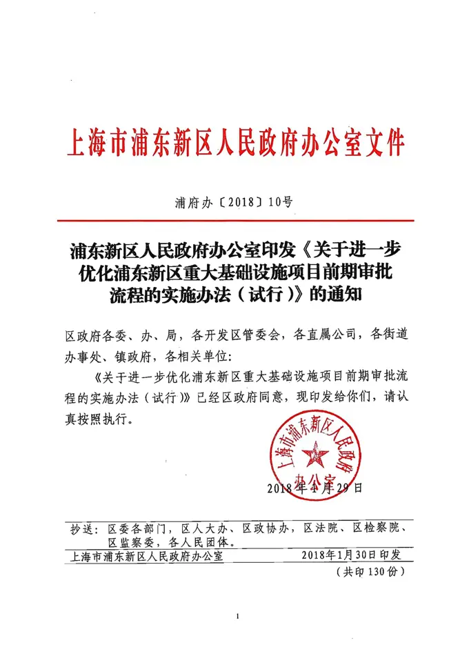 浦东新区人民政府办公室印发《关于进一步优化浦东新区重大基础设施项目前期审批流程的实施办法(试行)》的通知(浦府办〔2018〕10号)