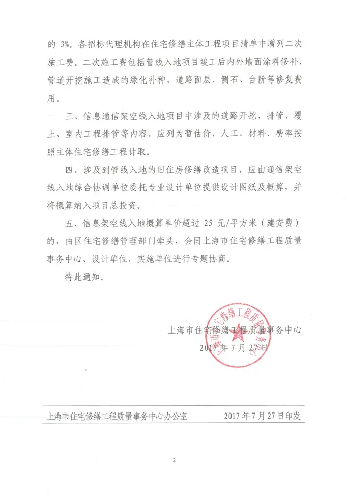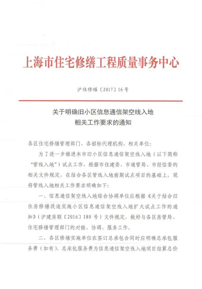 关于明确旧小区信息通信架空线入地相关工作要求的通知 (沪住修缮[2017]16号)