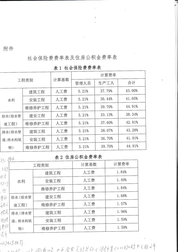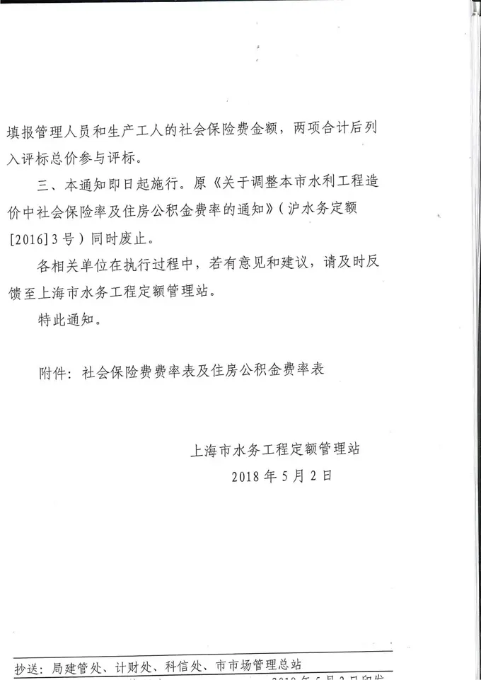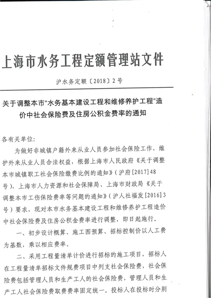 关于调整本市“水务基本建设工程和维修养护工程”造价中社会保险费及住房公积金费率的通知 (沪水务定额[2018]2号)