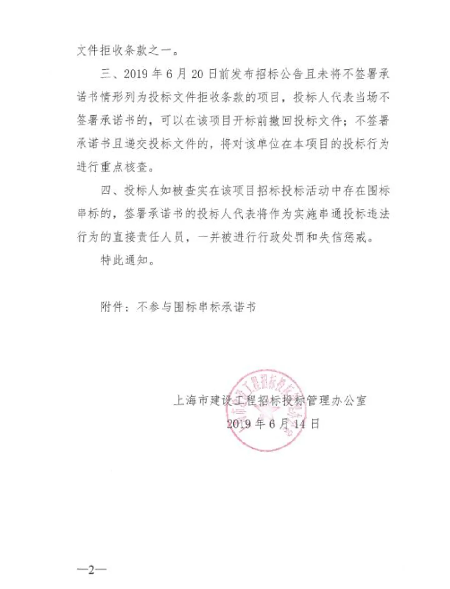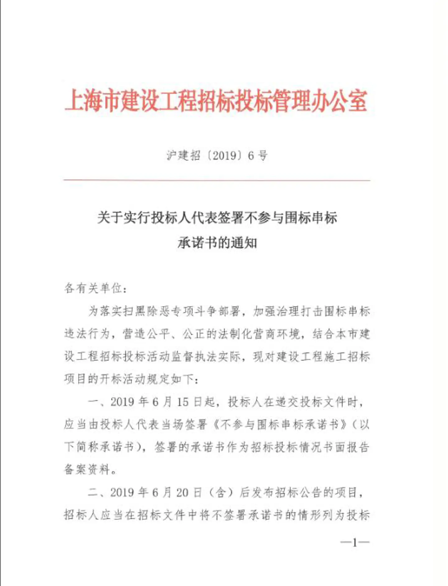关于实行投标人代表签署不参与围标串标承诺书的通知 沪建招〔2019〕6号