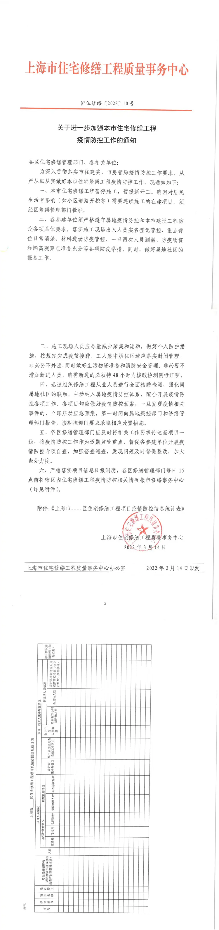 沪住修缮〔2022〕10号《关于进一步加强本市住宅修缮工程疫情防控工作的通知》