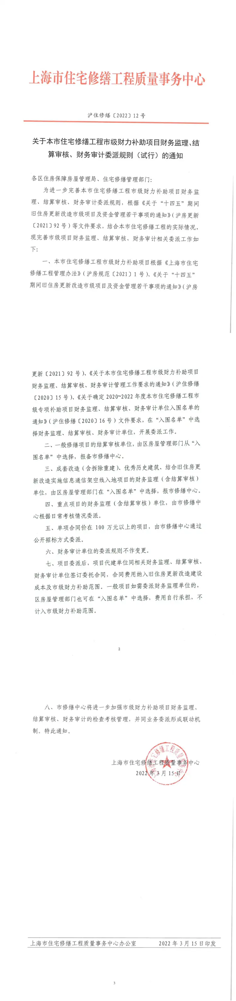 沪住修缮〔2022〕12号《关于本市住宅修缮工程市级财力补助项目财务监理、结算审核、财务审计委派规则(试行)的通知》