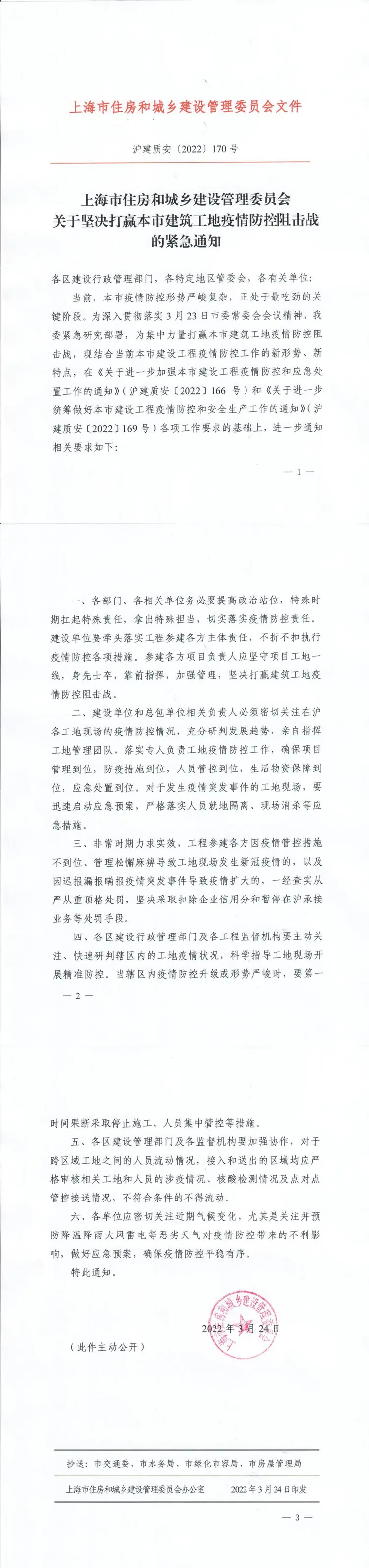 沪建质安〔2022〕170号《关于坚决打赢本市建筑工地疫情防控阻击战的紧急通知》