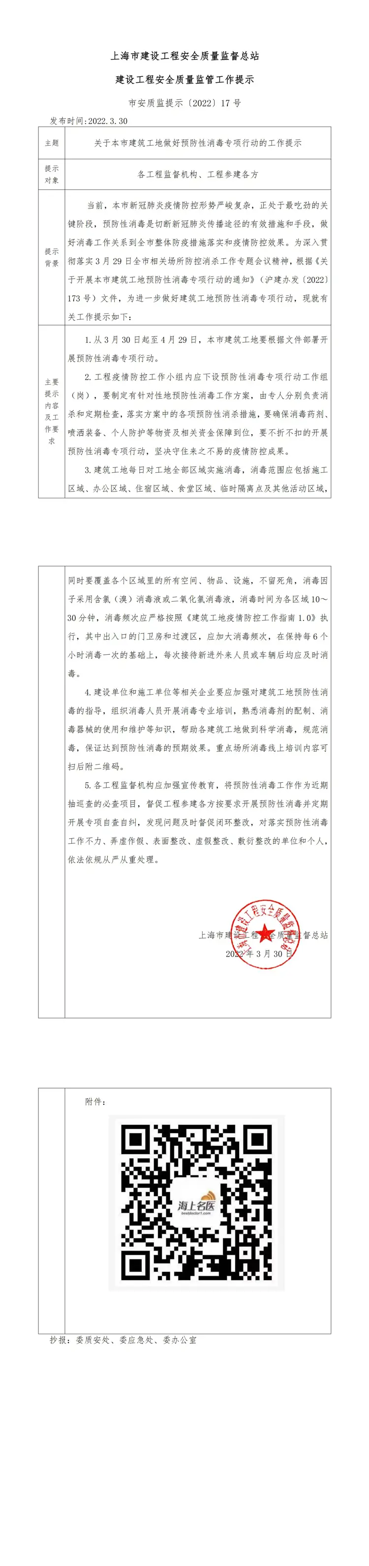 市安质监提示〔2022〕17 号《关于本市建筑工地做好预防性消毒专项行动的工作提示》