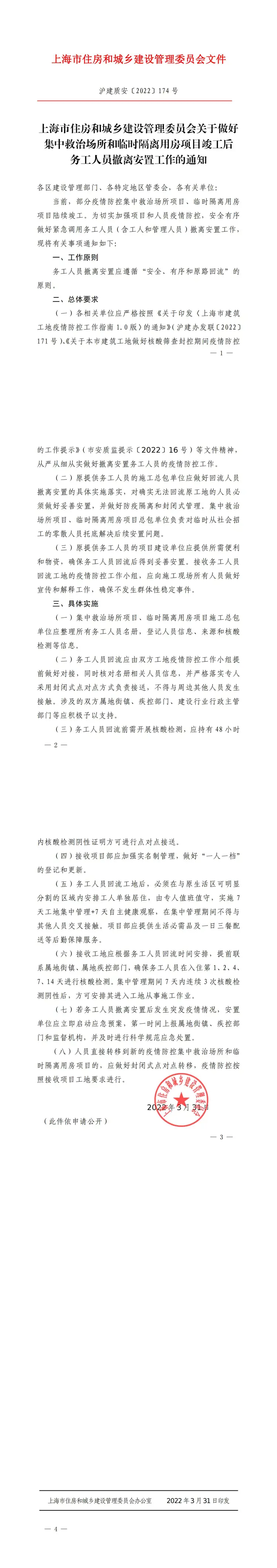 沪建质安〔2022〕174 号《上海市住房和城乡建设管理委员会关于做好 集中救治场所和临时隔离用房项目竣工后 务工人员撤离安置工作的通知》