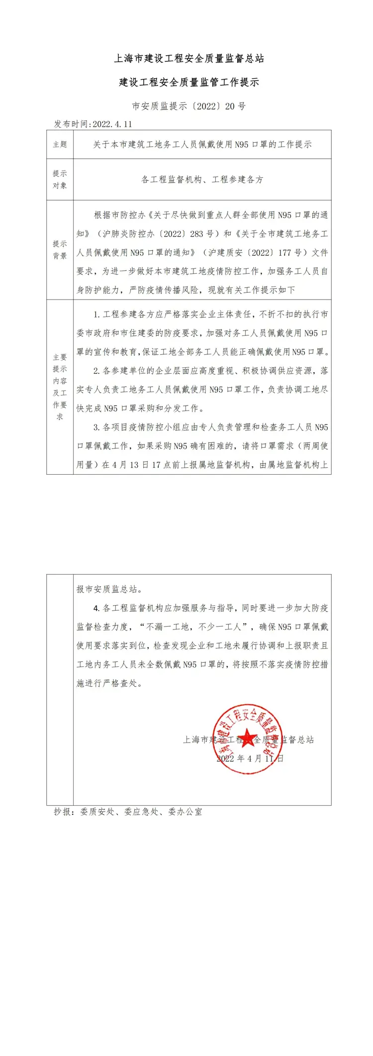 市安质监提示〔2022〕20 号《关于本市建筑工地务工人员佩戴使用 N95 口罩的工作提示》