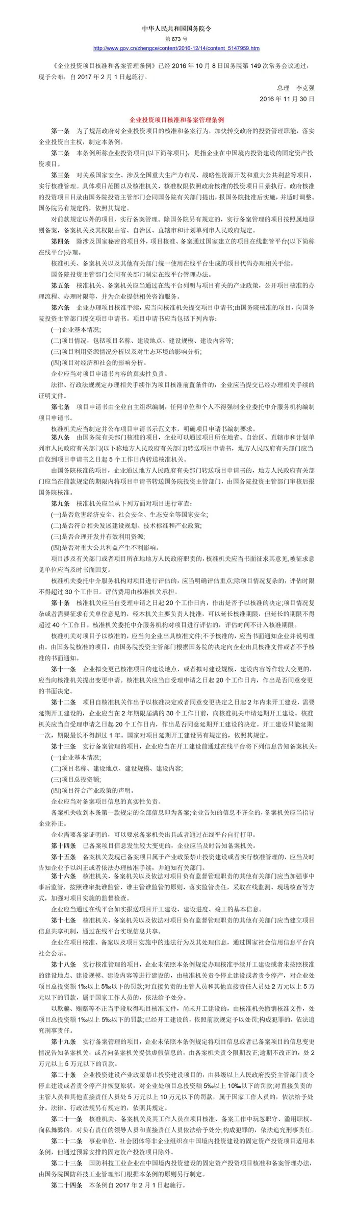 《企业投资项目核准和备案管理条例》【国务院令第673号】