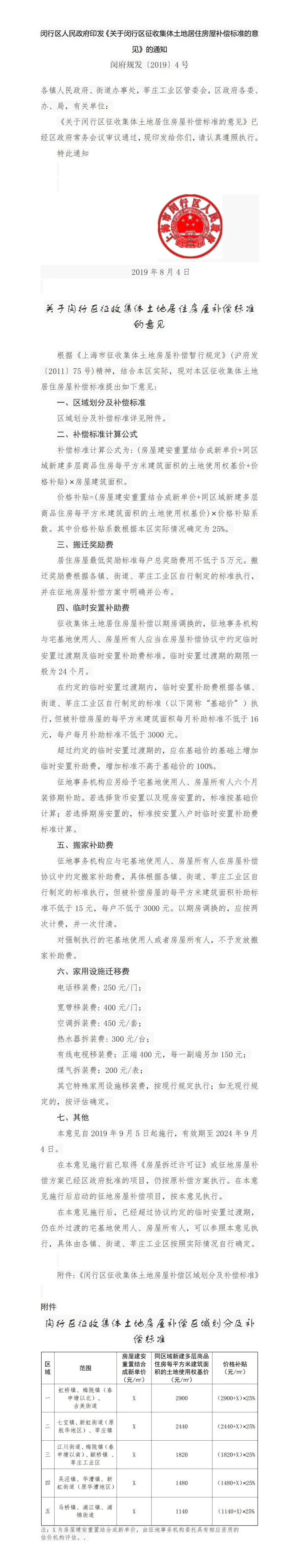 [闵行]印发《关于闵行区征收集体土地居住房屋补偿标准的意见》的通知【闵府规发〔2019〕4号】