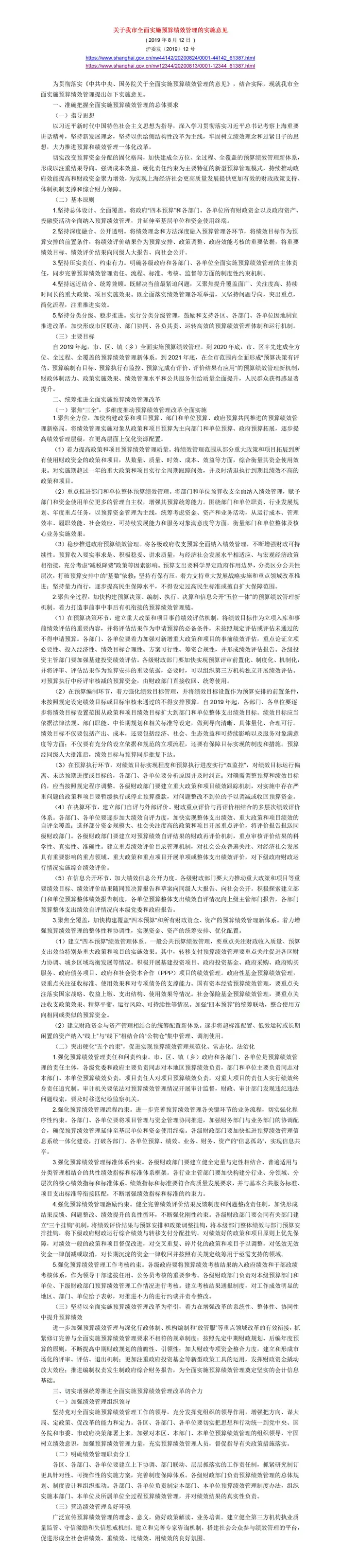 [市委市府] 中共上海市委上海市人民政府关于我市全面实施预算绩效管理的实施意见【沪委发〔2019〕12号】