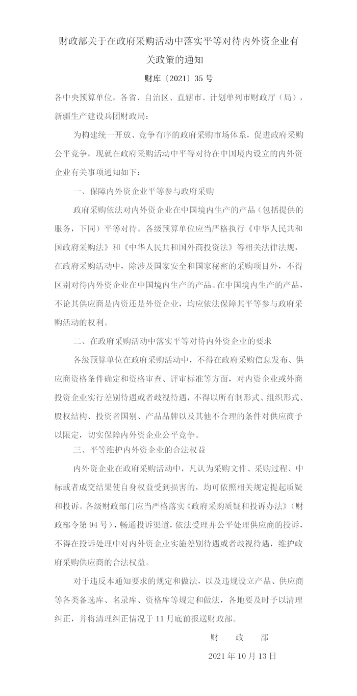 《财政部关于在政府采购活动中落实平等对待内外资企业有关政策的通知》-财库〔2021〕35号_01